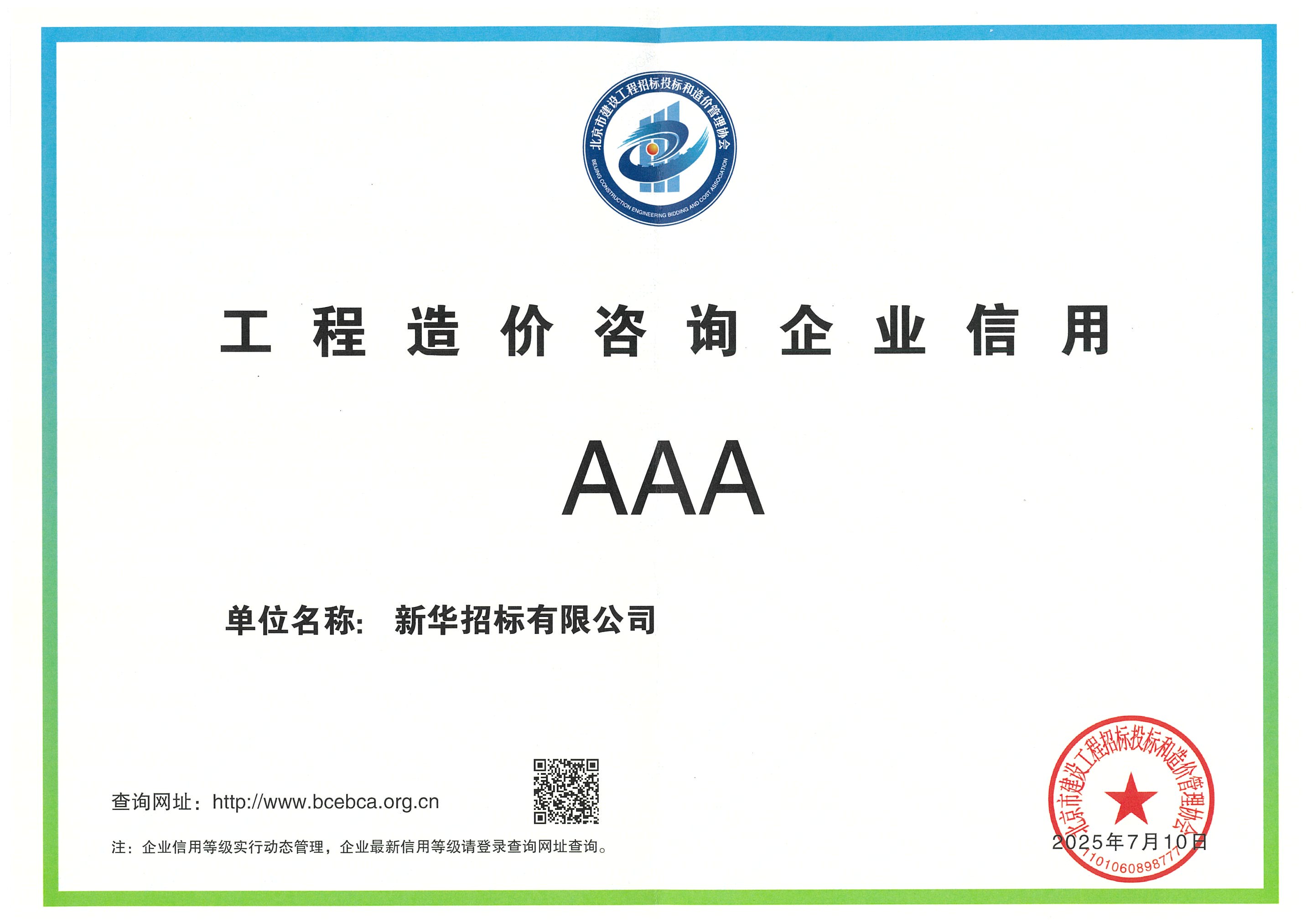 喜報|新華招標有限公司榮獲京標價協(xié)工程造價咨詢企業(yè)信用 AAA 級榮譽